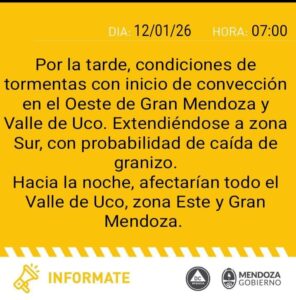De acuerdo con el organismo, durante la tarde de este lunes comenzará una desmejora marcada en las condiciones del tiempo. Las tormentas se desarrollarían entre la tarde y la noche, con mayor probabilidad de actividad severa en los departamentos del Este y en el Valle de Uco, además del Gran Mendoza.